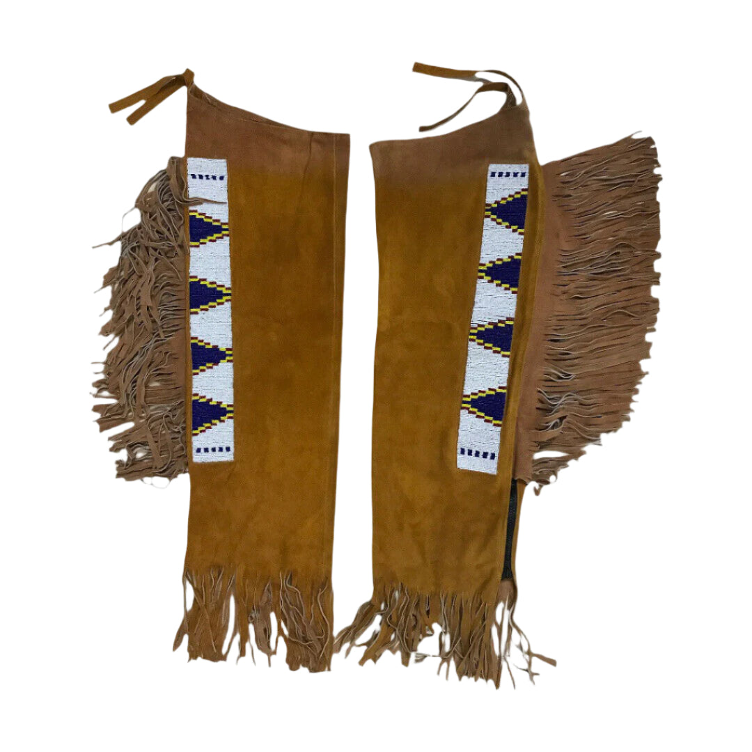 Shop our premium selection of Powwow leather beaded chaps and leggings, featuring Native American Designed Craftsmanship and intricate beadwork. Each pair is handcrafted using high-quality leather and traditional techniques, perfect for powwow dancers, cultural ceremonies, and collectors. Our beaded chaps and leggings offer a striking blend of durability, tradition, and artistry—ideal for completing your Native American regalia with pride and authenticity.